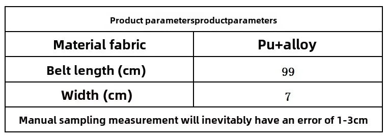 La ceinture associe deux matériaux complémentaires : le cuir PU et le métal. Le cuir PU, moderne et durable, offre une surface lisse et élégante qui rappelle le cuir véritable tout en étant plus accessible et facile d’entretien. Sa souplesse permet un confort optimal, même avec une largeur importante. Le métal, quant à lui, se retrouve dans la boucle et dans les détails de finition. Il apporte robustesse, éclat et solidité, tout en renforçant le caractère luxueux de la ceinture. Cette alliance entre douceur du cuir PU et brillance métallique crée un équilibre parfait entre confort et sophistication.